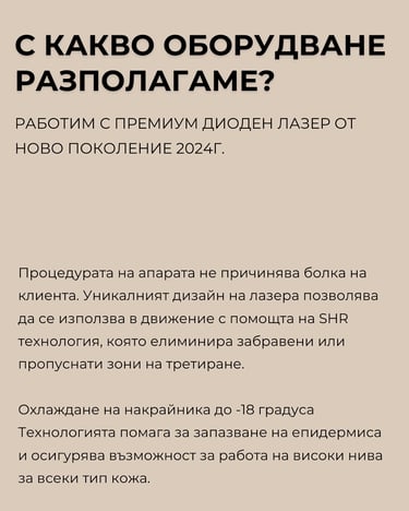 С гордост можем да кажем, че от 2022 г. украинският ни екип работи успешно в България, пренасяйки частица от Украйна в Несебър и Бургас. Ние високо ценим Вашето доверие и се стремим да Ви предоставим високо ниво на обслужване и качество на нашата работа. За нас това не са просто думи – това е нашата мисия. В нашите две студиа предлагаме професионални услуги лазерна епилация и апаратен масаж, осигуряващи ви максимален комфорт и желания резултат.